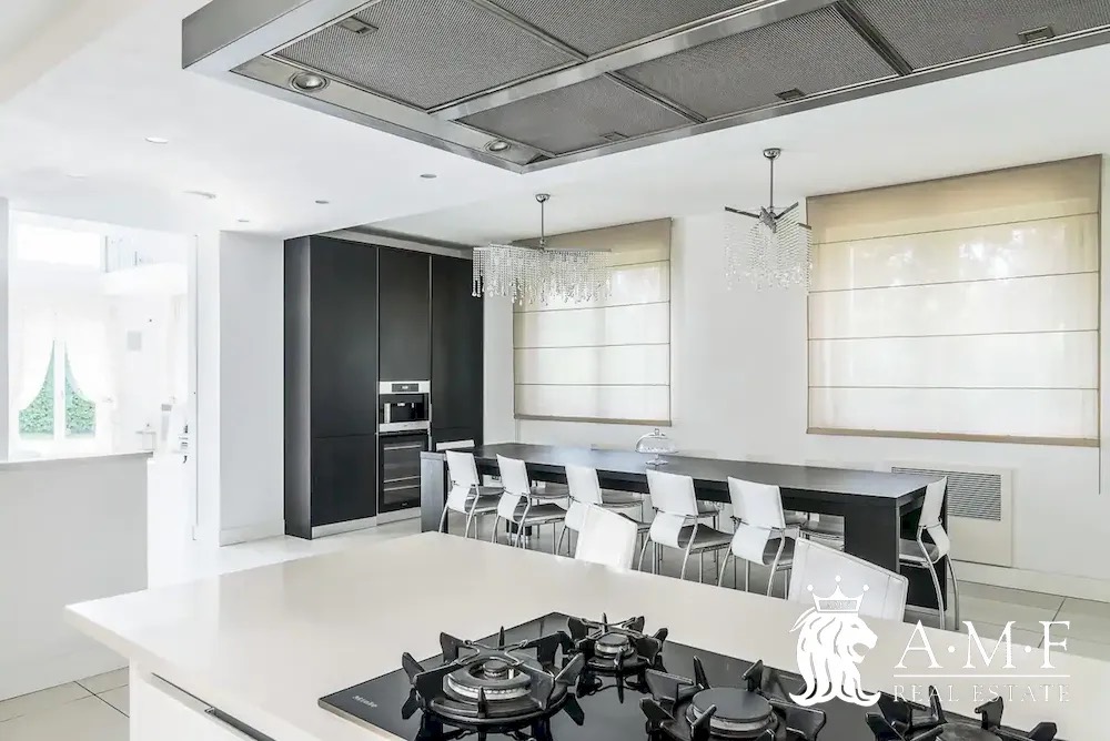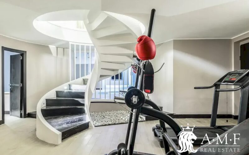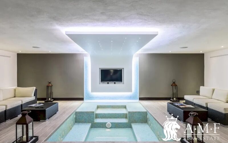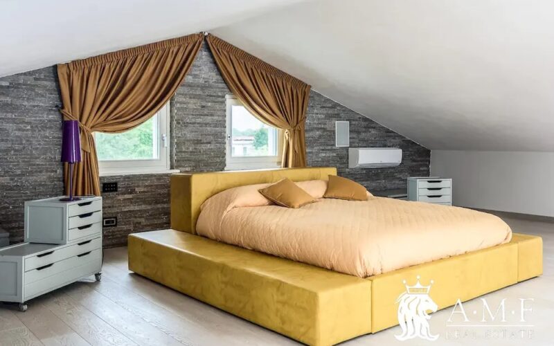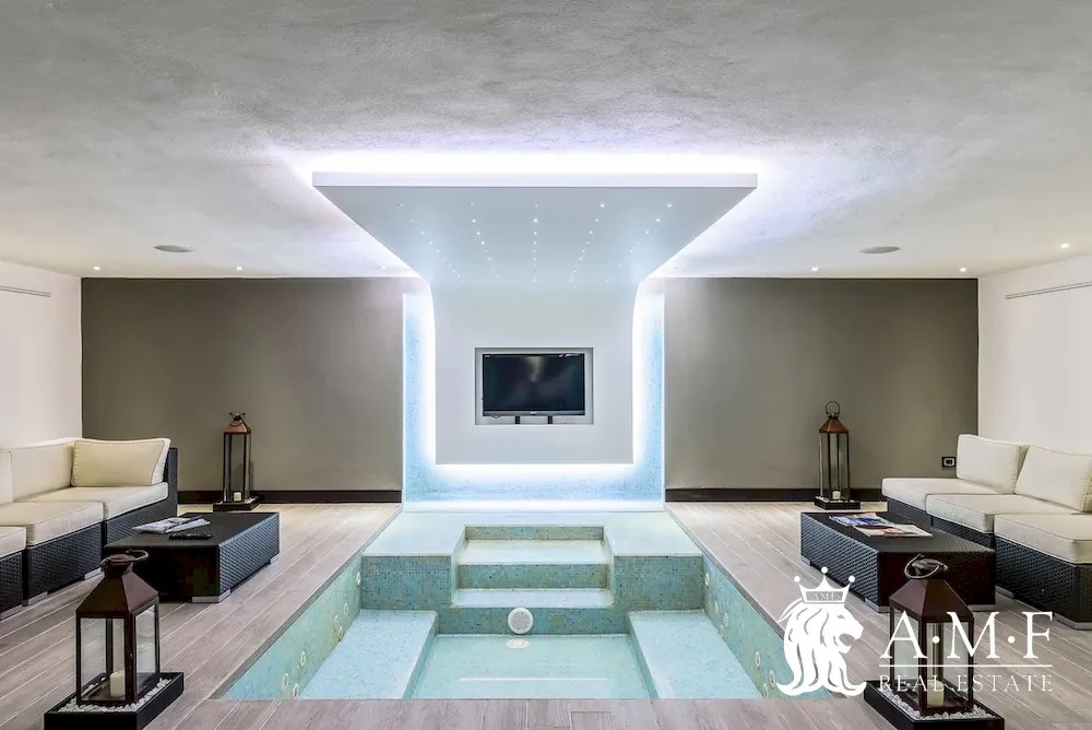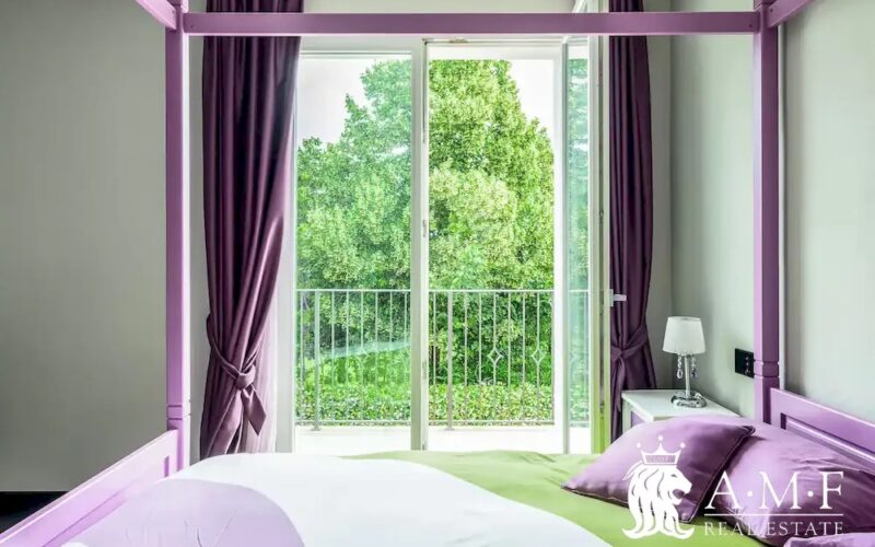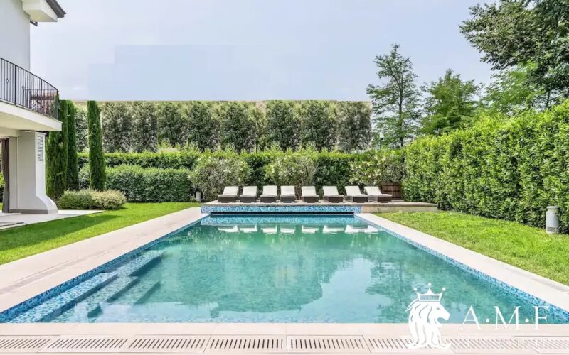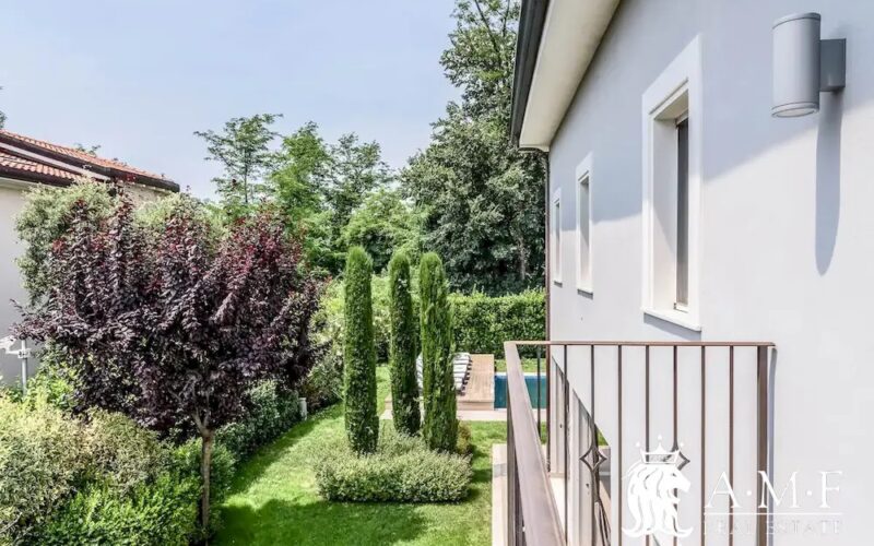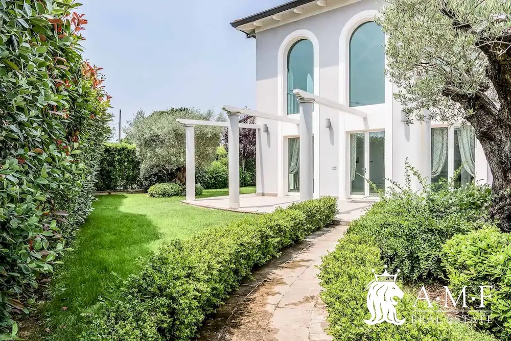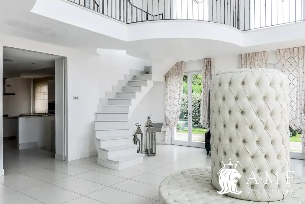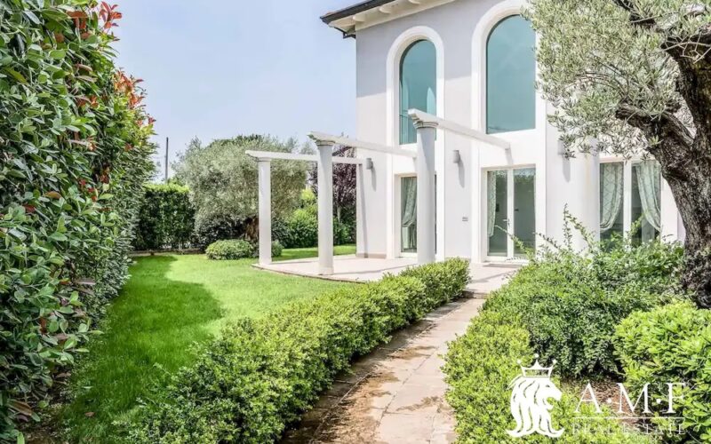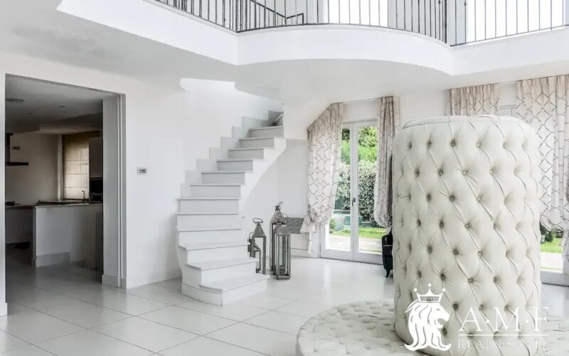 Elegant and contemporary, this spacious villa boasts almost 600 sqm. of living space filled with elegant furnishings and luxury amenities, plus five suite-style bedrooms. Immersed in a private garden outside the hustle and bustle of the city centre, the structure is still close to the classic seaside resort of Forte dei Marmi. Inside the villa three living levels are connected by a characteristic helical staircase. The home was recently finished and is arranged around a combination entry and living room with a loft balcony, beautiful arched windows, lovely chandeliers and tufted seating. The elegant and fully equipped kitchen offers both a formal dining table and casual breakfast bar and opens into a smaller, more intimate seating area.