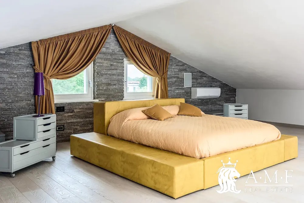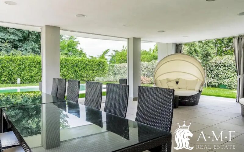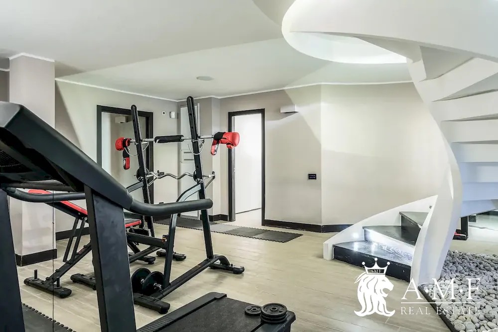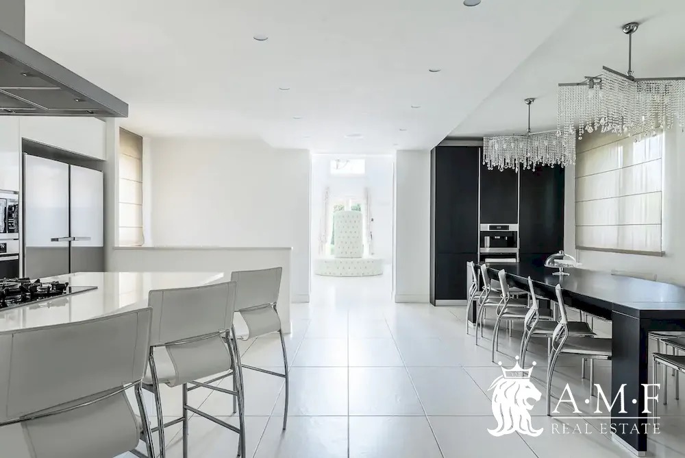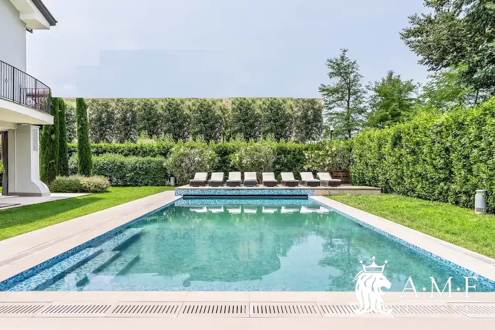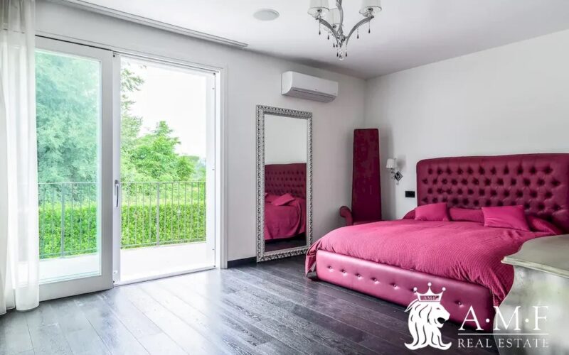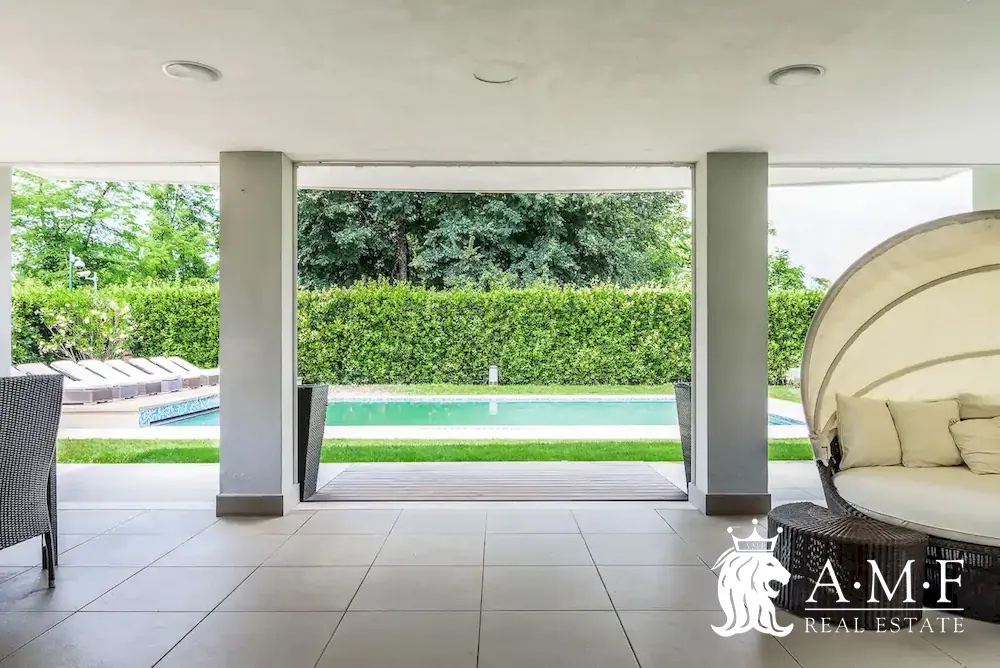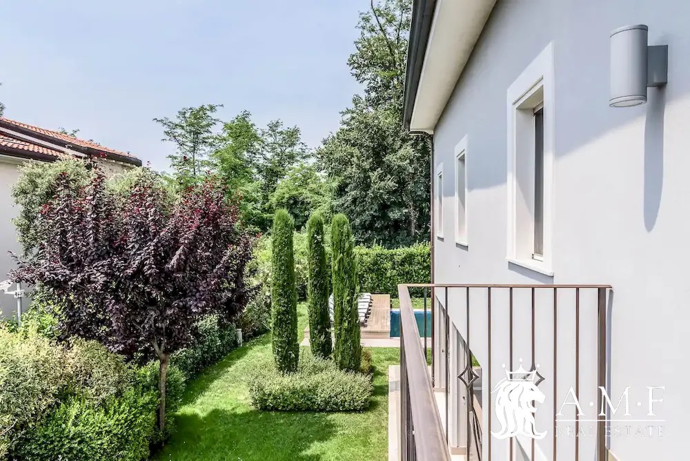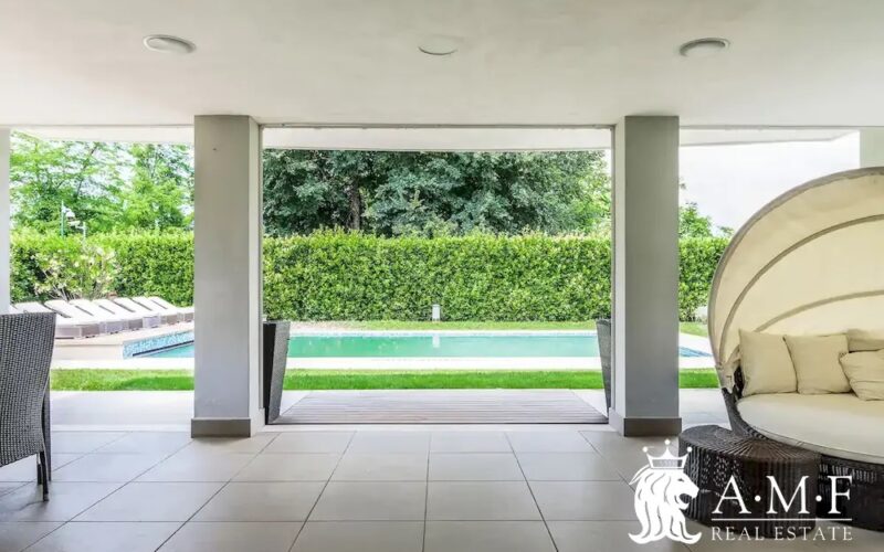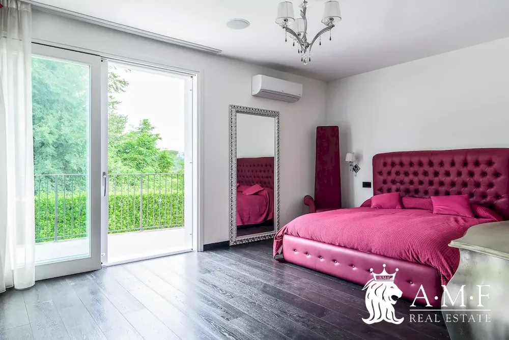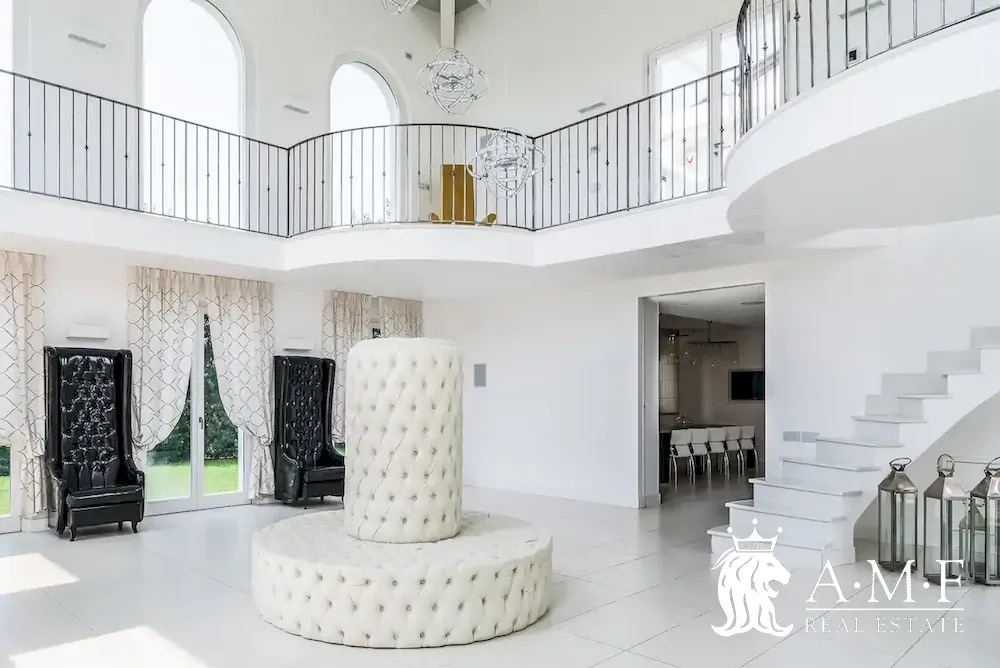 Elegant and contemporary, this spacious villa boasts almost 600 sqm. of living space filled with elegant furnishings and luxury amenities, plus five suite-style bedrooms. Immersed in a private garden outside the hustle and bustle of the city centre, the structure is still close to the classic seaside resort of Forte dei Marmi. Inside the villa three living levels are connected by a characteristic helical staircase. The home was recently finished and is arranged around a combination entry and living room with a loft balcony, beautiful arched windows, lovely chandeliers and tufted seating. The elegant and fully equipped kitchen offers both a formal dining table and casual breakfast bar and opens into a smaller, more intimate seating area.