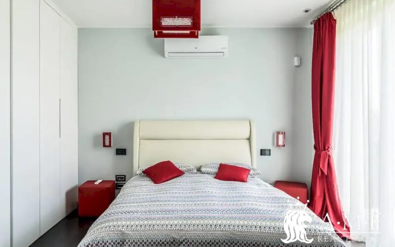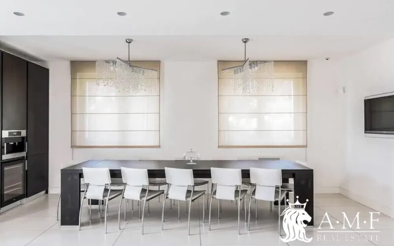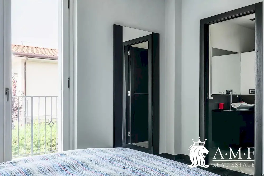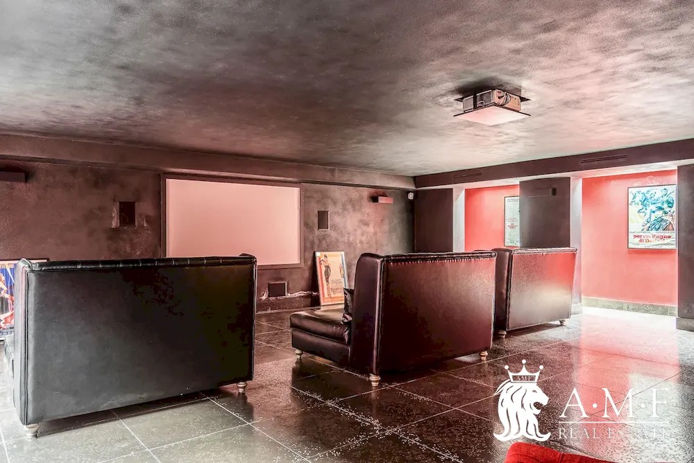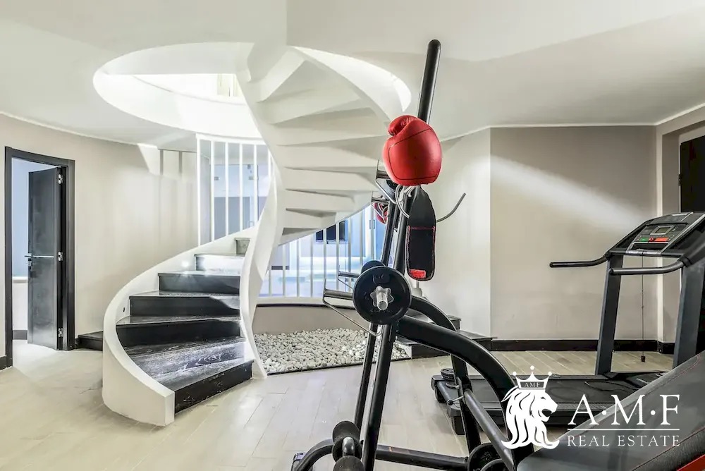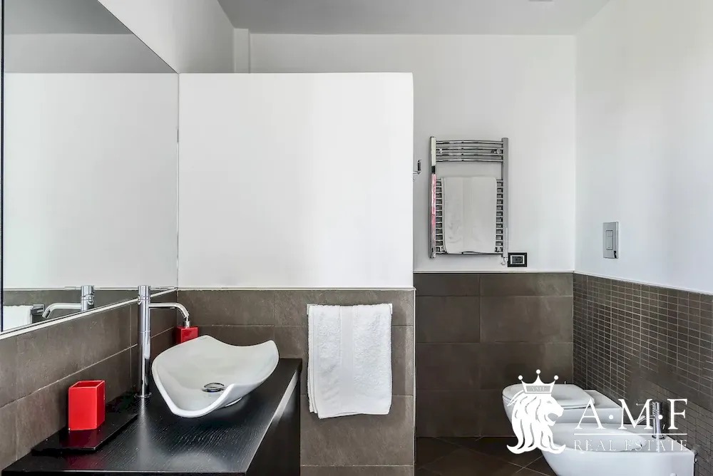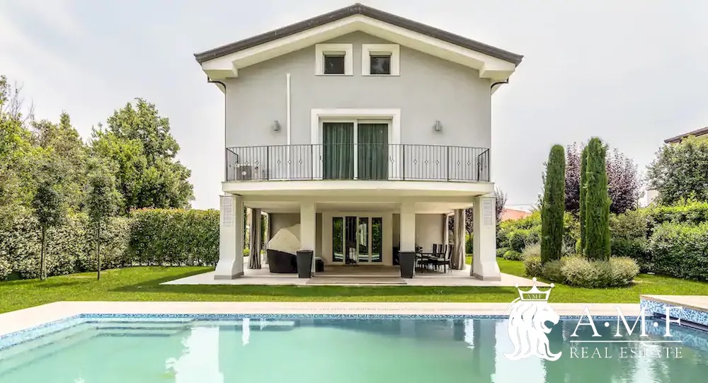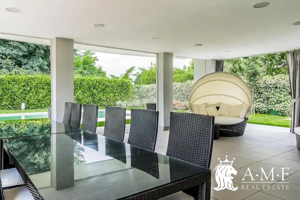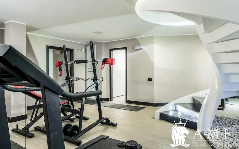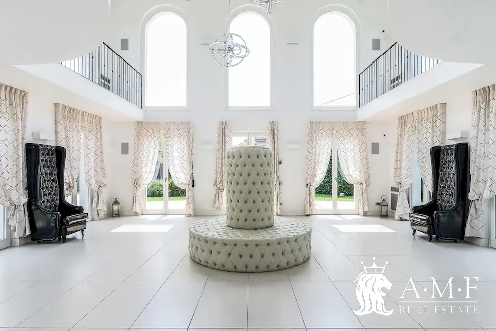 Elegant and contemporary, this spacious villa boasts almost 600 sqm. of living space filled with elegant furnishings and luxury amenities, plus five suite-style bedrooms. Immersed in a private garden outside the hustle and bustle of the city centre, the structure is still close to the classic seaside resort of Forte dei Marmi. Inside the villa three living levels are connected by a characteristic helical staircase. The home was recently finished and is arranged around a combination entry and living room with a loft balcony, beautiful arched windows, lovely chandeliers and tufted seating. The elegant and fully equipped kitchen offers both a formal dining table and casual breakfast bar and opens into a smaller, more intimate seating area.